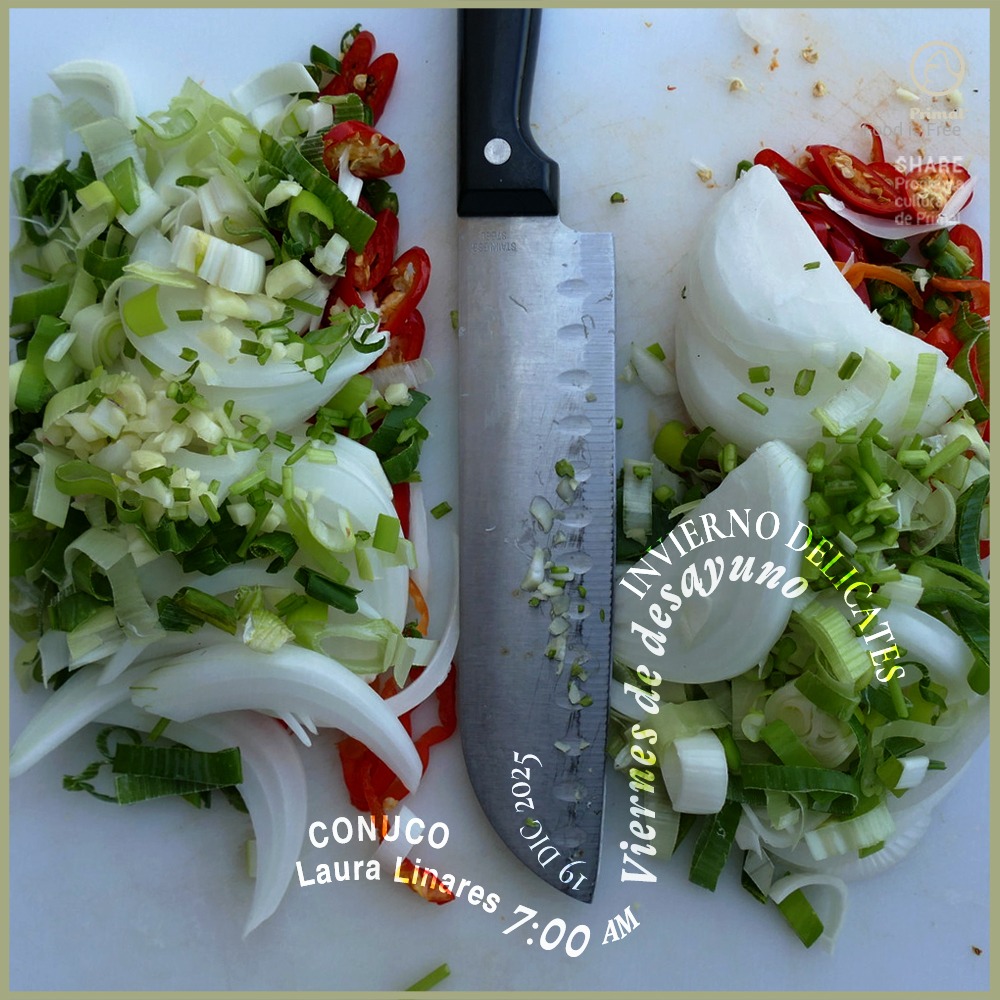 La temperatura invernal de la Ciudad de México a las 7:00 AM nos invita a una experiencia única. A lo largo de la primavera, verano y otoño de este año, hemos dado vida a un simulador de paisaje andino, evocando los saberes de la región de Táchira, Venezuela a través de recetas. La estancia de Laura Linares en VDD ha intensificado los espacios del estudio de Primal, para imaginar un laboratorio que recrea y honra las recetas propuestas. A través de su proyecto Conuco* ha investigado y recolectado de la memoria de sus familiares y amigos una documentación de gran significado y valor no sólo para su propia cultura, sino observar una auténtica genealogía latinoamericanista. Vemos cómo las siembras previas de Lucía Álvarez** y el aprendizaje sobre la masa madre junto a Violeta Celis*** cuidaron y crearon las condiciones necesarias de la tierra para recibir plántulas de cebolla que Laura trajo a inicios de 2025, acrecentando una Genealogía del cuidado y la abundancia para Viernes de Desayuno.